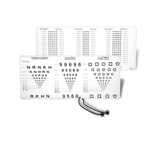 3 in 1 Near Visual Acuity Test contains 3 different optotypes in one easy to use chart; LEA SYMBOLS®, LEA NUMBERS®, and Sloan Letter. The near vision card contains lines with proportionally spaced (logMAR) optotypes in ETDRS, format; line sizes range from 20/400 to 20/10 (6/120 to 6/3) equivalent.