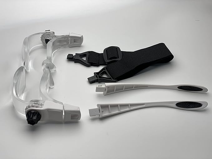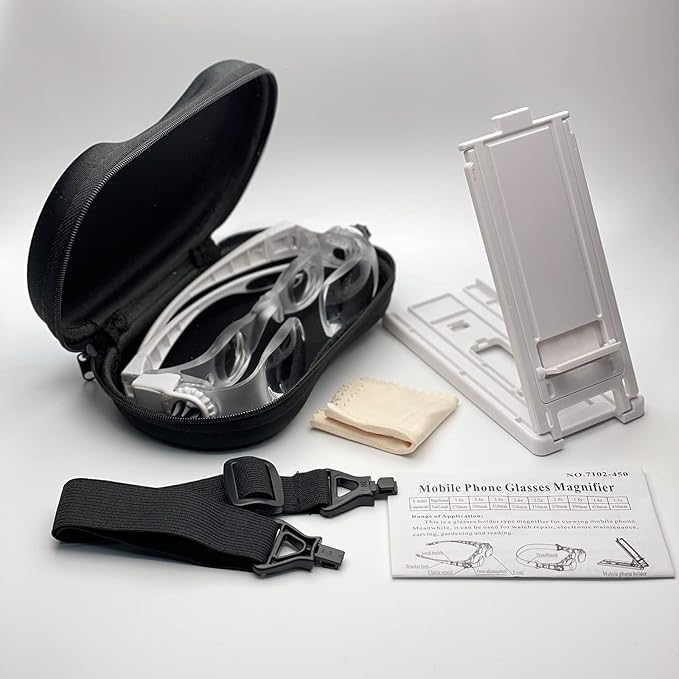 • Abundant accessories are included: 1 Magnifier glasses with detachable temples, 1 detachable elastic band holder, 1 cellphone support/holder, 1 cleaning cloth, 1 user manual.