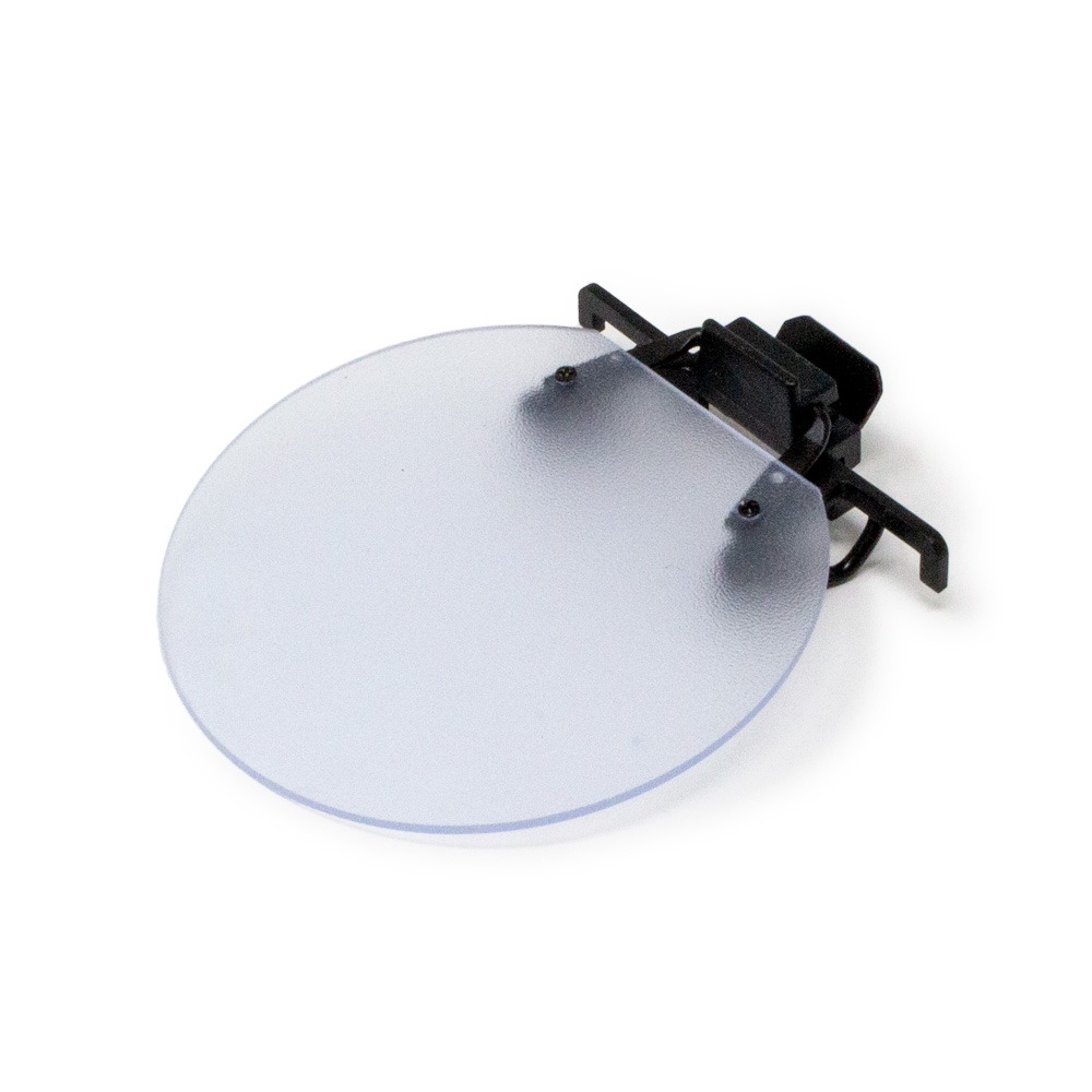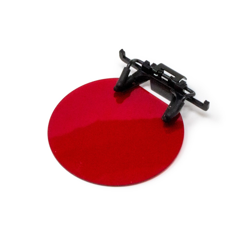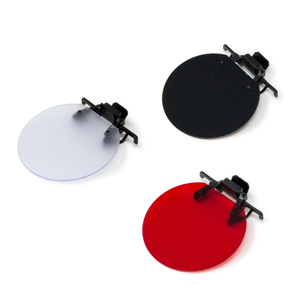 The occulders are made of thick plexiglasss, roughly 1mm. The red filter works with Bernell red/green products for accurate cancellation and training. The black filer does not let any light through. The translucent filter is roughly 20/400 in occlusion to allow for peripheral fusion and the ability to see the patient’s eye, by the practitioner, to observe movement.